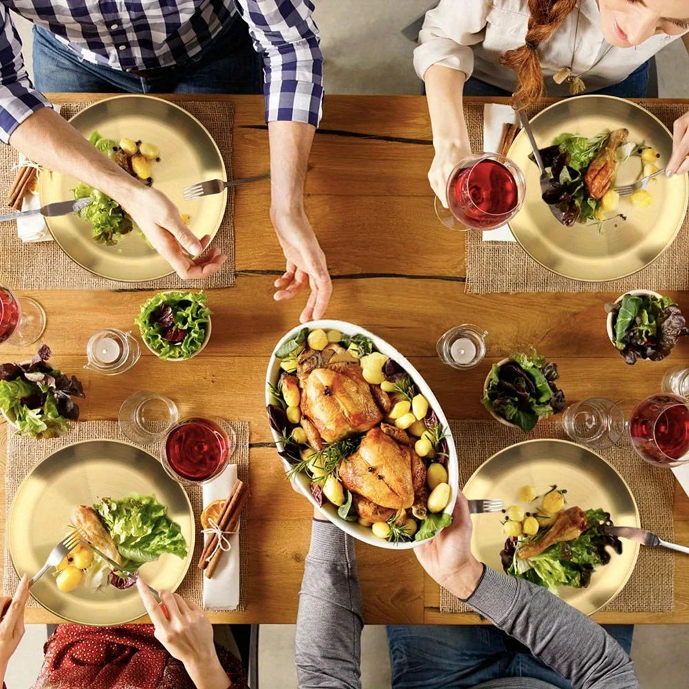 6Pcs Gold Stainless Steels Round Plate Rust-Proof Shallow Tray Plate Camping Plate BBQ Picnic Dishes Cookware