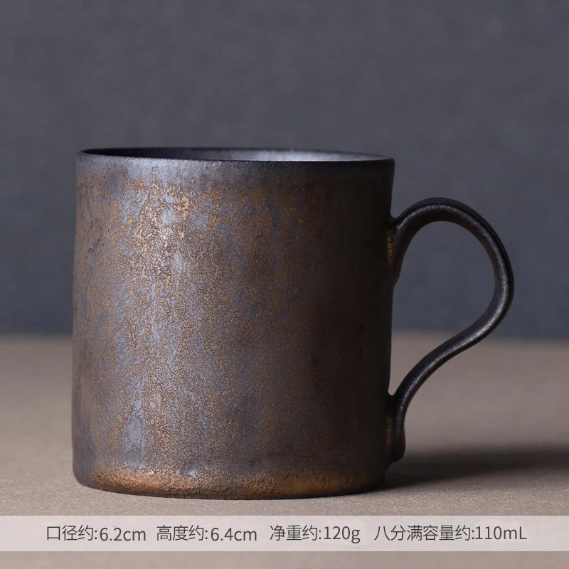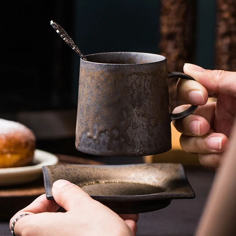 Taza de café de cerámica, juego de taza y platillo de estilo japonés, taza retro dorada creativa, taza de té, bandeja pequeña, taza de agua para el hogar con platillo